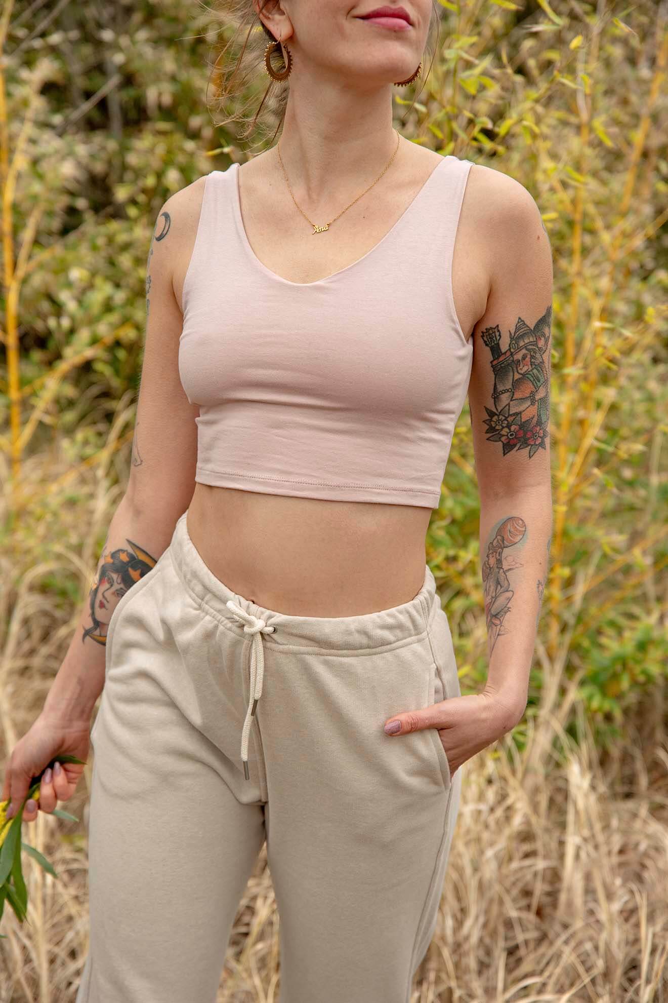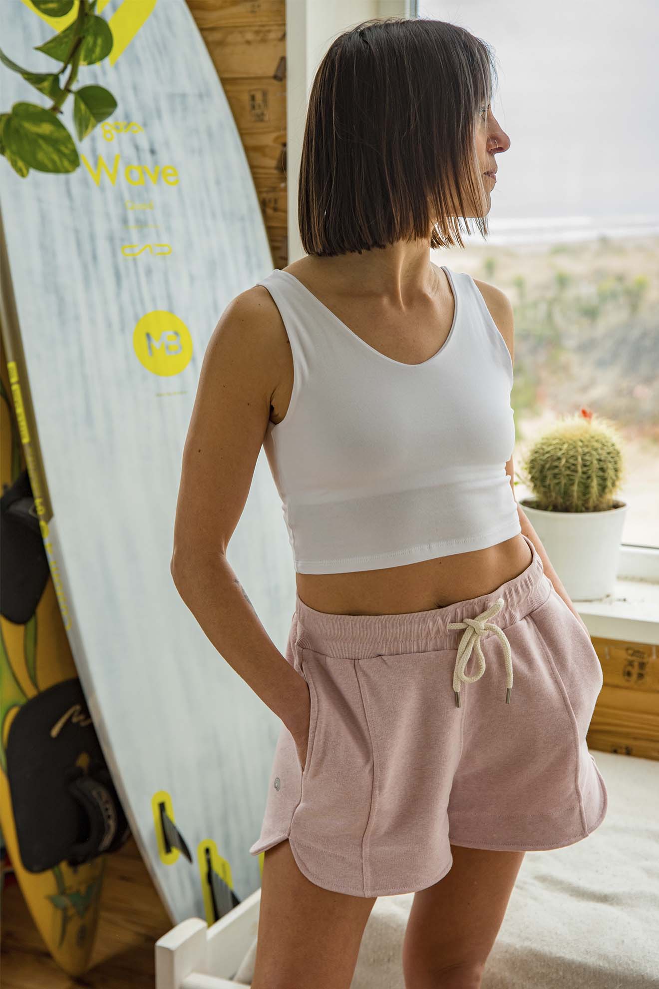 Remera crop sin mangas, escote en v con corpiño interno incorporado para mejor sujeción ofreciendo la posibilidad de no usar top debajo. Pensado específicamente para la práctica: te permite moverte libremente e invertir, quedando siempre dónde debe estar. Brinda la comodidad y sostén de un Top, pero viste como una remera. Su espalda trae un escote profundo muy hermoso y delicado que suma frescura. Confeccionado en algodón elastizado.