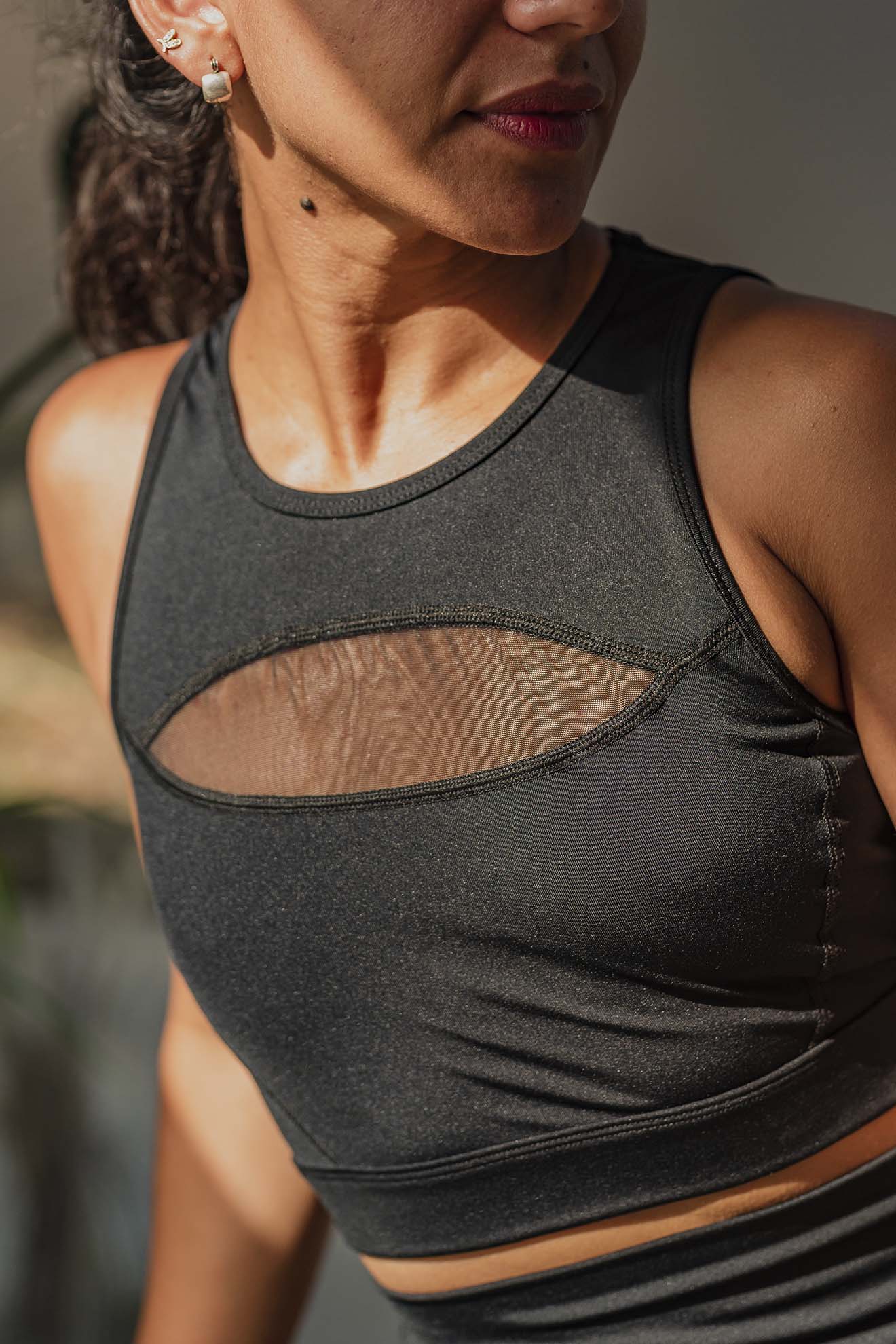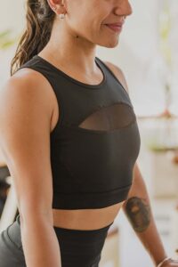 Top deportivo que ofrece excelente sostén y adaptabilidad, tengas poco o mucho busto, porque es cerrado a los costados y con un detalle muy especial: