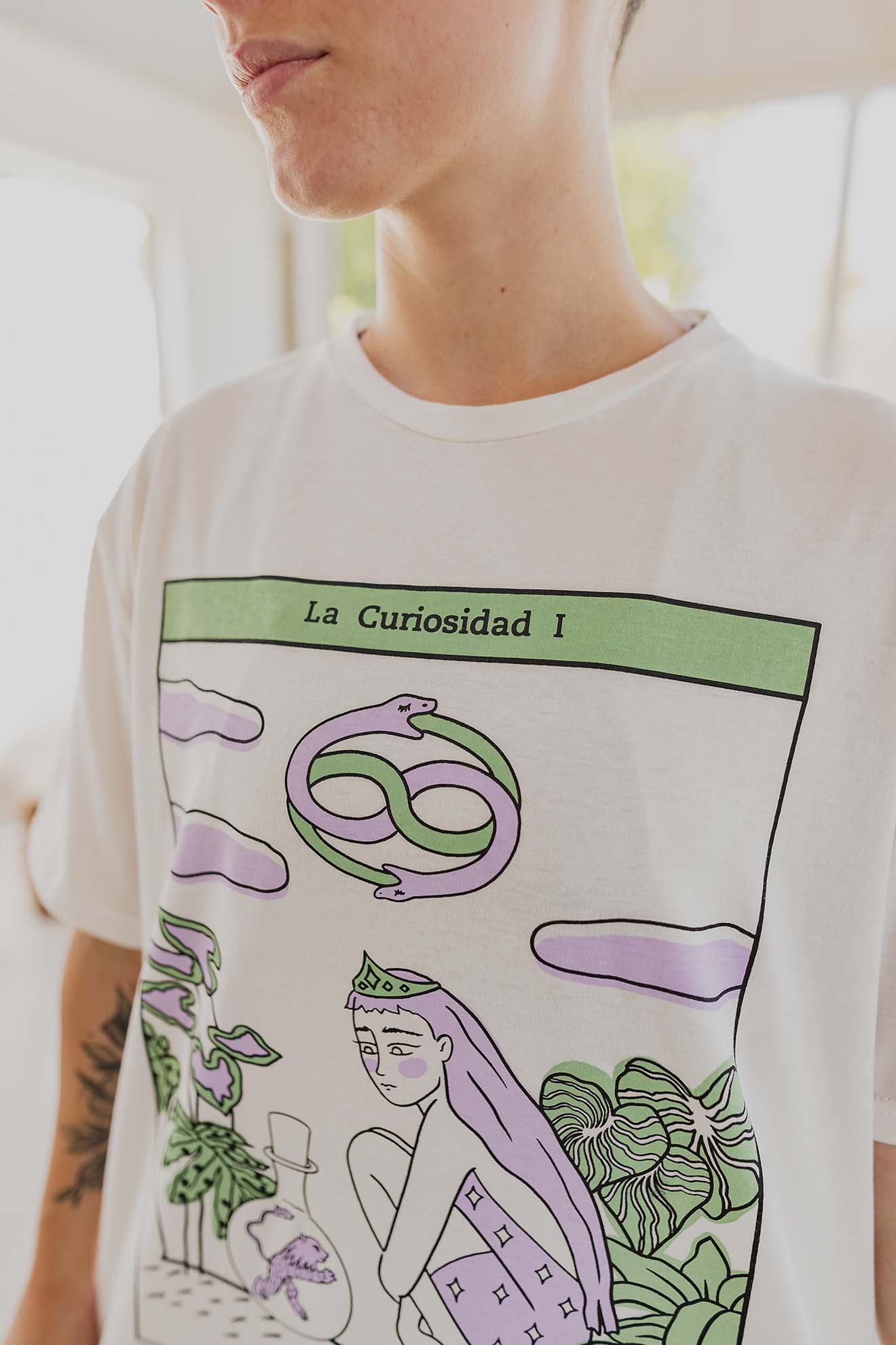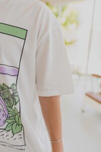 Está confeccionada íntegramente en jersey de algodón, un tejido respirable y suave al contacto con la piel. Trae una estampa hermosa al frente realizada en serigrafía artesanal con tintas al agua.